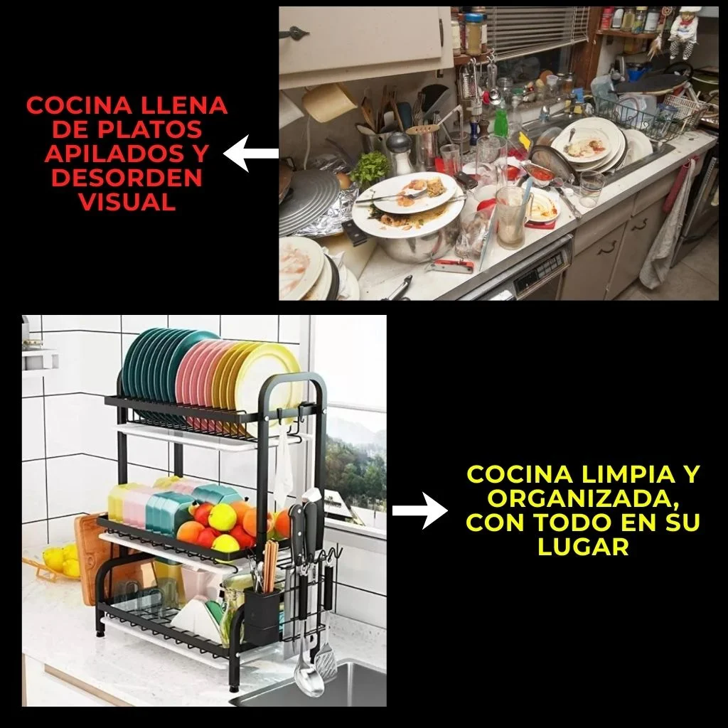 Deja de lidiar con platos apilados y desorden que hace ver tu cocina saturada. Con este escurridor de 3 niveles podrás organizar toda tu vajilla en un solo lugar, mantener tu espacio limpio y disfrutar de una cocina más práctica y agradable todos los días.